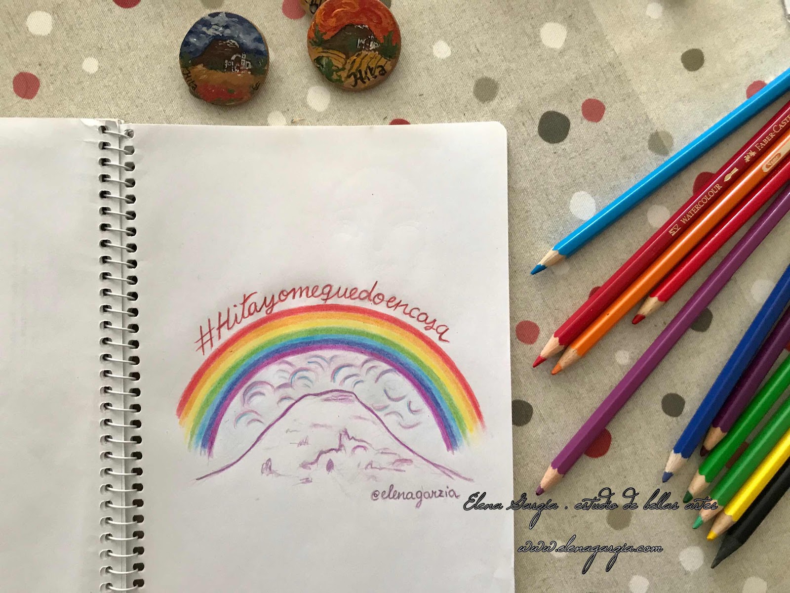 Mi pueblo es Hita, por lo que he hecho algo del pueblo de lo que me acuerdo mucho, en este caso es su “skyline” o perfil que se recorta en el horizonte, lo he dibujado y le he puesto encima un bonito arcoíris y unas palabras de ánimo.